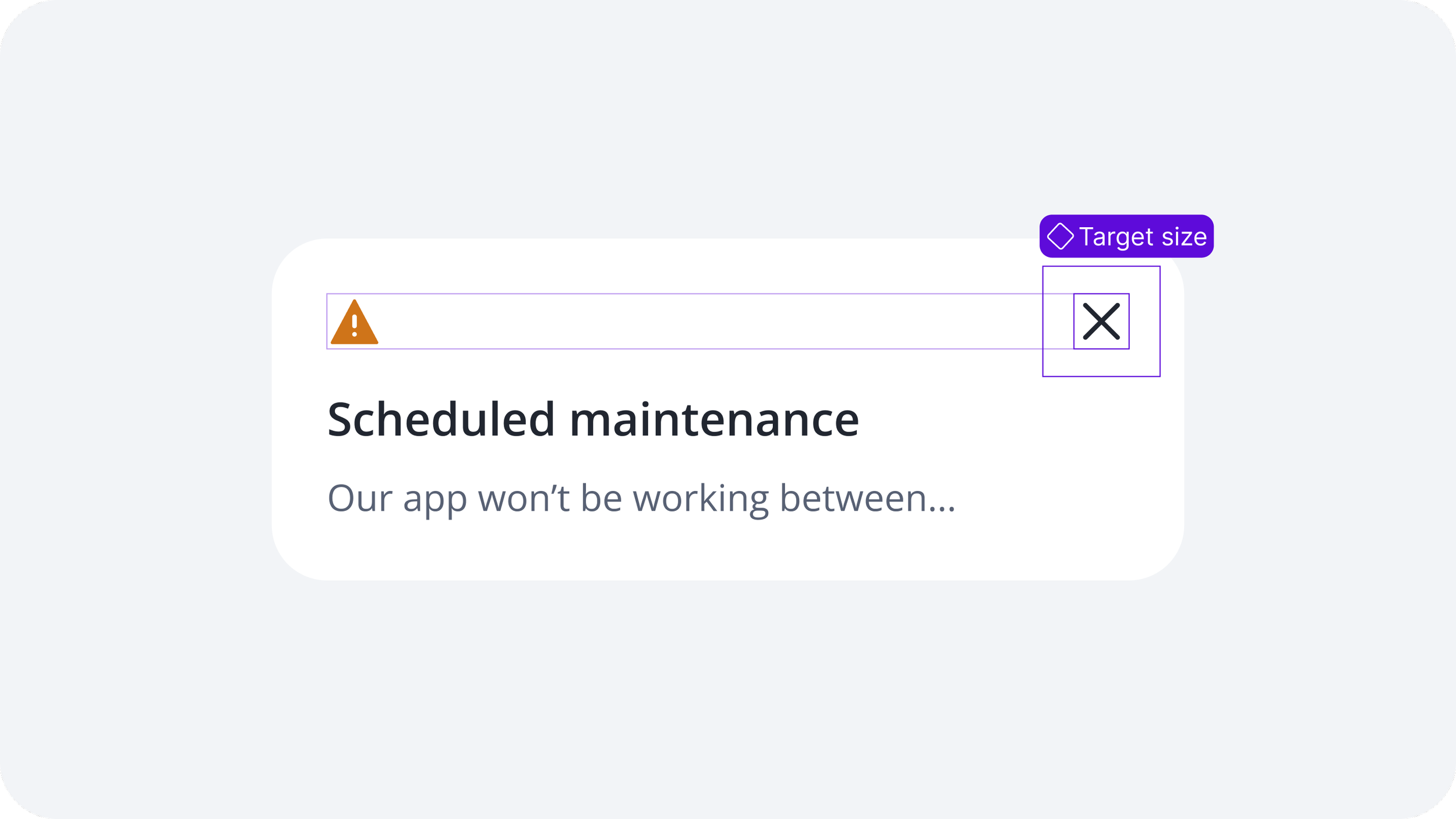 In this example, I extended the close button’s touch target to 48×48dp per Android guidelines by adding a target size container in Figma, guiding developers to apply the hitSlop prop without affecting Figma’s auto layout.