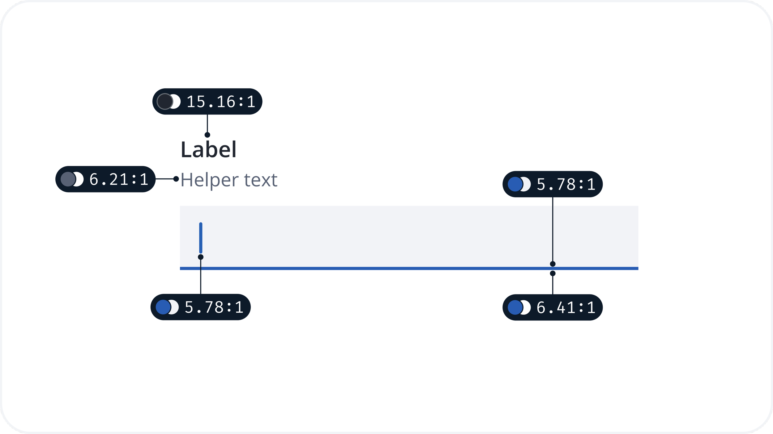 An example of a text input component with colour contrast annotations that I created to document accessible contrast ratios on light and dark modes.